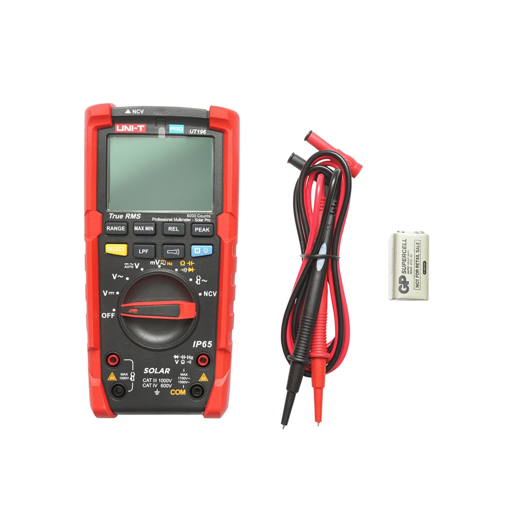 Този професионален цифров мултиметър Solar Pro UT196, 1700V True RMS UNI-T е с 9 V батерия, вградена LED светлина, размери 195 x 95 x 58 мм, тегло 480 г и защита IP65.
