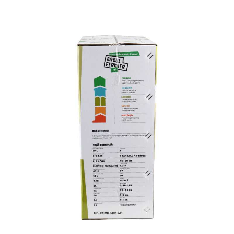 Пръскачка MF 20L Pandora с акумулатор G01 е електрически модел с вграден акумулатор 12V/8Ah. С едно зареждане осигурява до 2,5 часа непрекъсната работа, а времето за зареждане е 7–8 часа. Максималното работно налягане е 5,5 бара, а капацитетът на пръскане – 2,6 литра/минута. Вграденият регулатор на налягането позволява точно регулиране на количеството на изпръсканата течност. LED индикаторите показват нивото на заряда и състоянието на батерията.