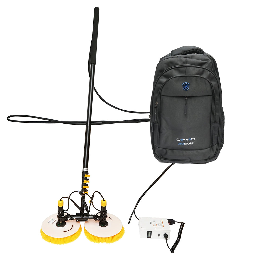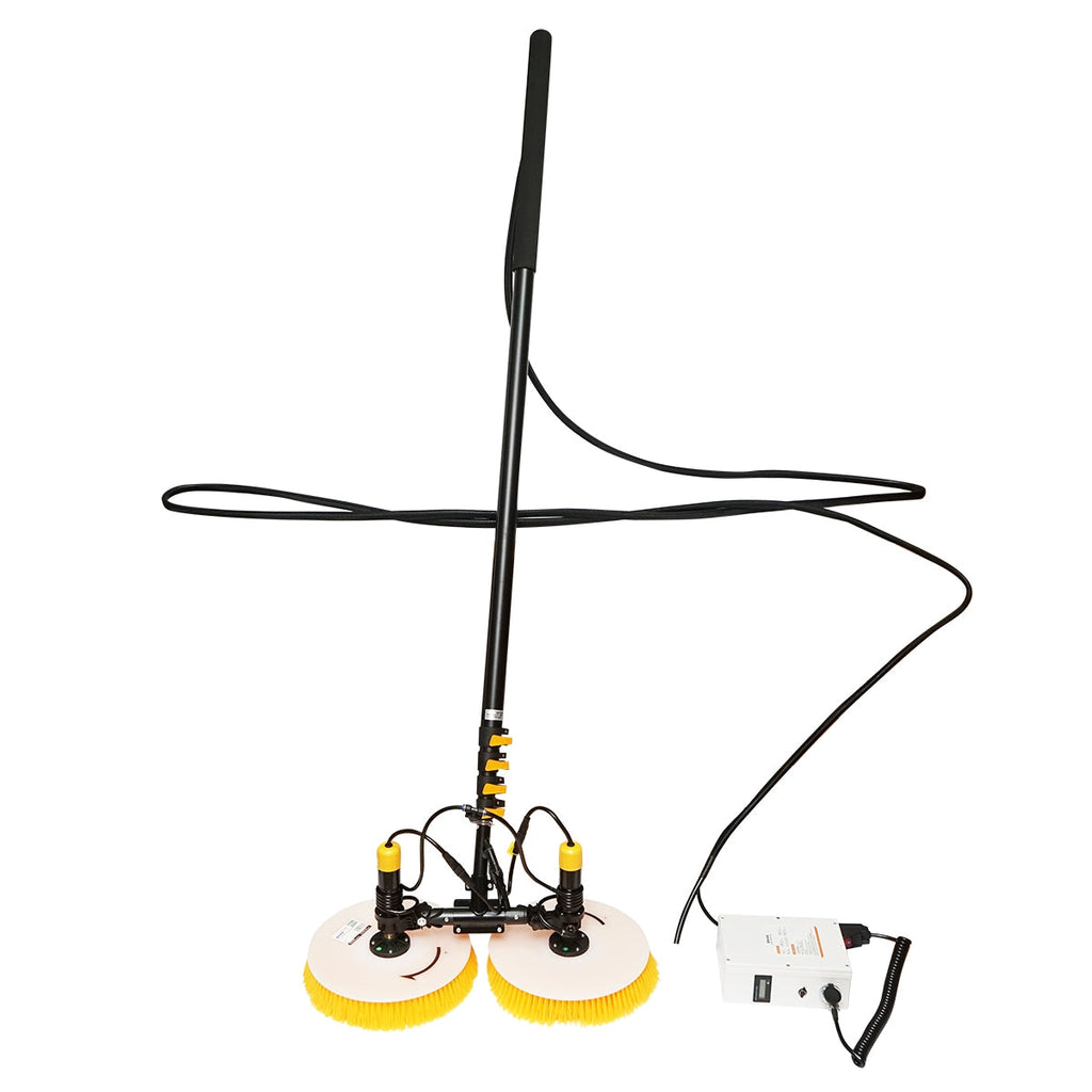 Тази система за почистване на фотоволтаични соларни панели с 2 четки, 24V, /26Ah батерия и рамо до 7,5 м е оборудвана с литиева батерия с капацитет 26 Ah, напрежение 24 V, ток на зареждане < 5 A, размери 240 x 118 x 91 мм и тегло 3,6 кг. Дължината на телескопичното рамо е 2,1 м, а дължината на отвореното рамо е 7,5 м. Мощност на двигателя 240 W, захранващо напрежение 24 V и скорост 320 об/мин. Въртящите се четки са изработени от найлон и са с диаметър 300 мм.