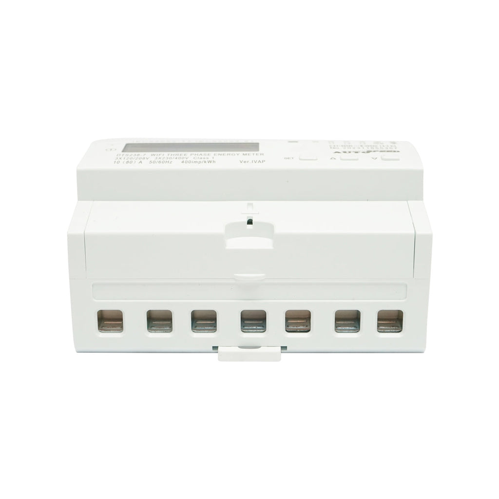 Този смарт метър трифазен 380V, 80A, DTS238-7 WIFI съвместим с Tuya, Smart Life, интелигентен електромер е оборудван с Autospeed LCD дисплей с интелигентен електромер, 2,4 GHz wi-Fi връзка и е съвместим с приложенията Tuya, Smart Life. Работна температура -25°C~+70°C, захранващо напрежение 90 -300 V, размери 126 x 98 x 52 мм, номинален ток 5(65) A и честота на импулсите 1600 имп/кВтч.