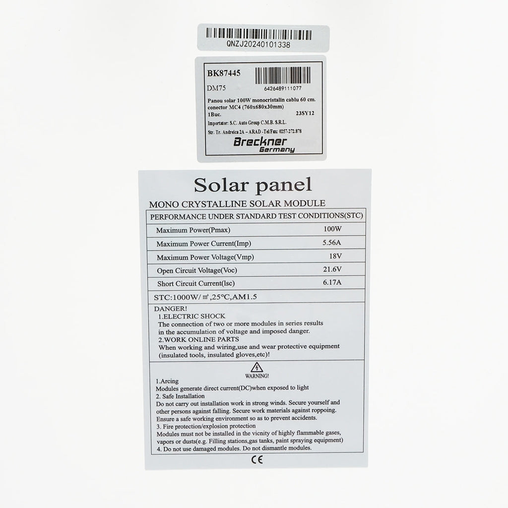 Този соларен панел 100W фотоволтаичен монокристален 760x680х30мм Breckner Germany има максимална мощност 100 W, интензитет 5,56 A, максимално напрежение 18 V, напрежение на отворена верига 21,6 V и размери 760 x 680 x 30 мм.